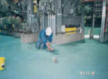6.用菲凡士地坪色漆(A:B=1:1)滾涂,達(dá)到色澤一致。在墻邊、柱邊、機(jī)器旁邊應(yīng)用毛刷小心涂刷,不能用滾筒涂,以防弄臟墻邊或機(jī)器;